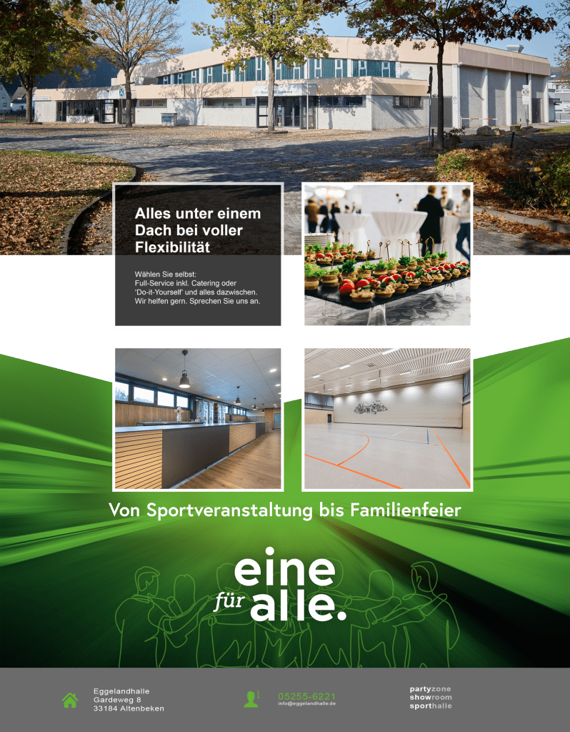 Von Groß- bis Kleinstveranstaltungen stellt die Eggelandhalle in Altenbeken flexible und variabel gestaltbare Räumlichkeiten zur Verfügung. Von Firmenveranstaltungen, Hausmessen, Sportevents bis zur kleinen Familienfeier finden Sie in der Eggelandhalle Altenbeken den passenden Raum und eine hervorragende Infrastruktur.